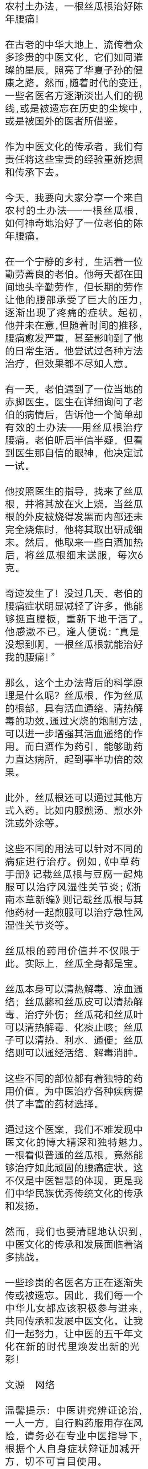 一个小小的丝瓜根,治好了老伯的腰痛,也让我们看见,中医文化从来不是高高在上的典籍,而是藏在田间地头、烟火日常里的温暖。只是如今,这些珍贵的经验正渐渐被遗忘,我们每个人,都该做文化的传承者,把这些老法子、老智慧,好好传下去,让千年的中医文化,在新时代里,重新焕发出属于它的光彩。