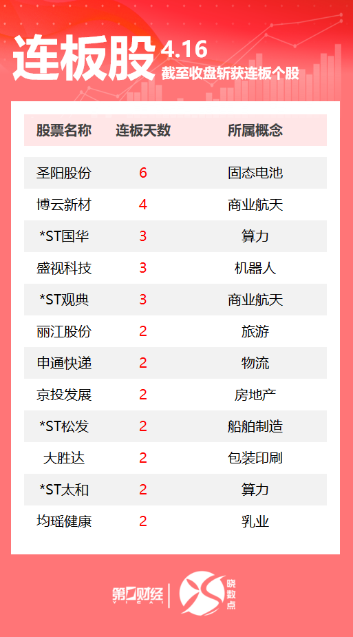 4月16日,Wind数据显示,A股市场共计88只个股涨停。其中固态电池板块圣阳股份收获6连板,商业航天板块博云新材4连板,机器人概念股盛视科技3连板。一图速览今日连板股>>